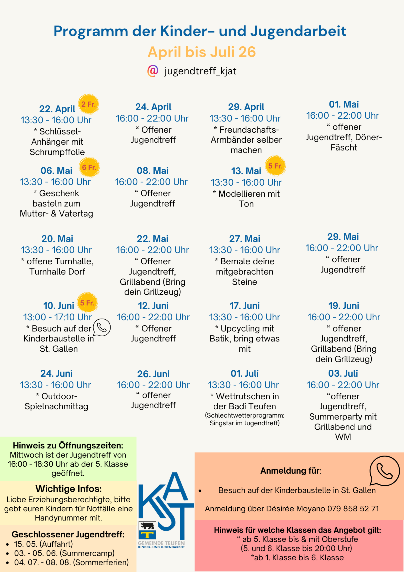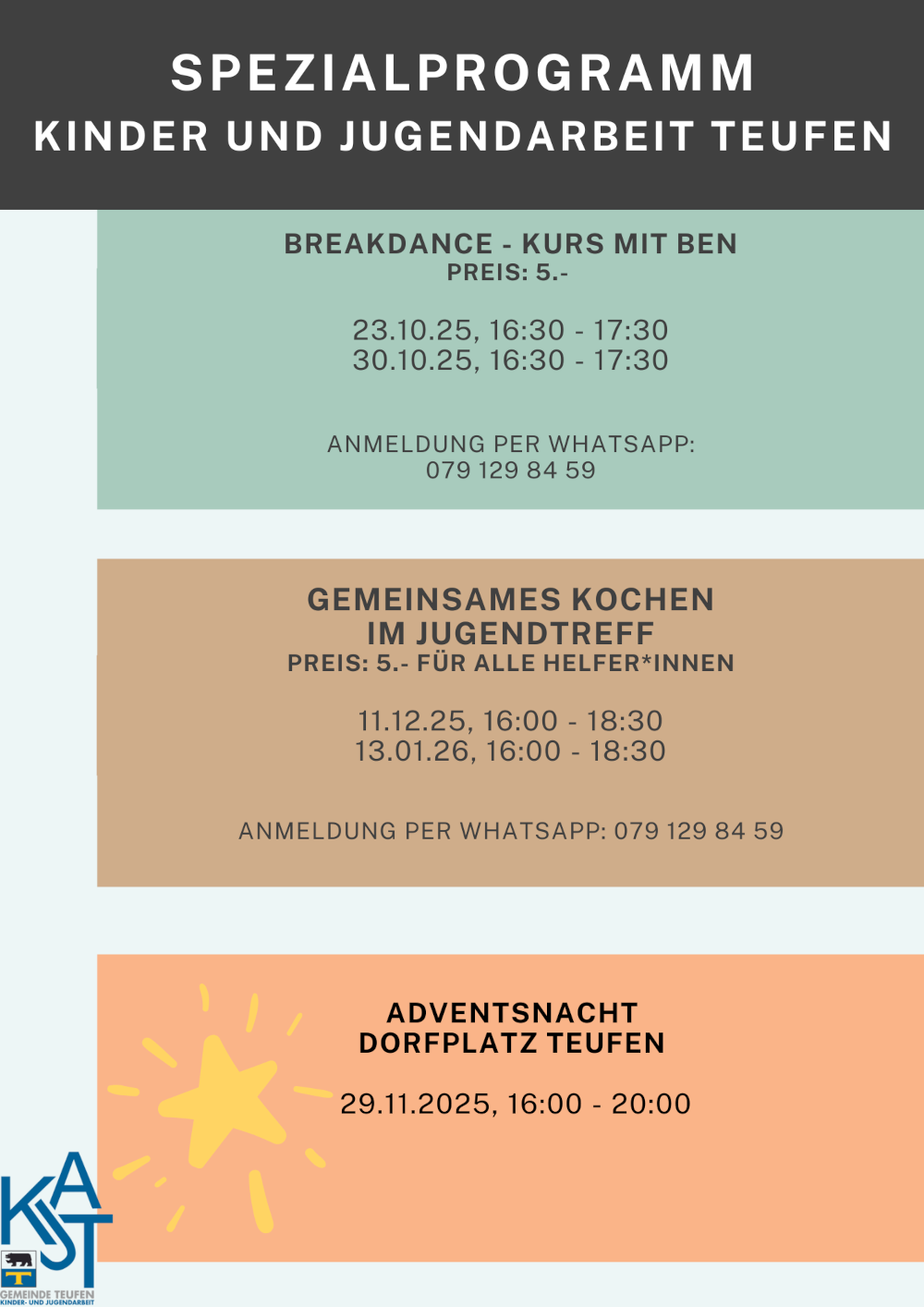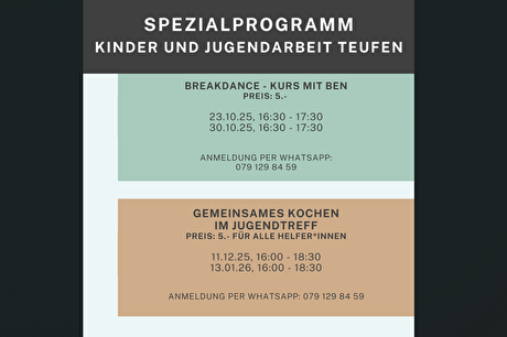 Unser Spezialprogramm wird an verschiedenen Tagen angeboten und richtet sich nach den Bedürfnissen und Wünschen der Kinder und Jugendlichen. In einem abwechslungsreichen und spannenden Lernfeld, das durch die Ideen und Kreativität der Kinder und Jugendlichen selbst entsteht, fördern wir die persönliche Entwicklung und bieten Raum für neue Entdeckungen. Regelmässig erwarten euch spannende Angebote, die individuell und mit viel Herz gestaltet werden.