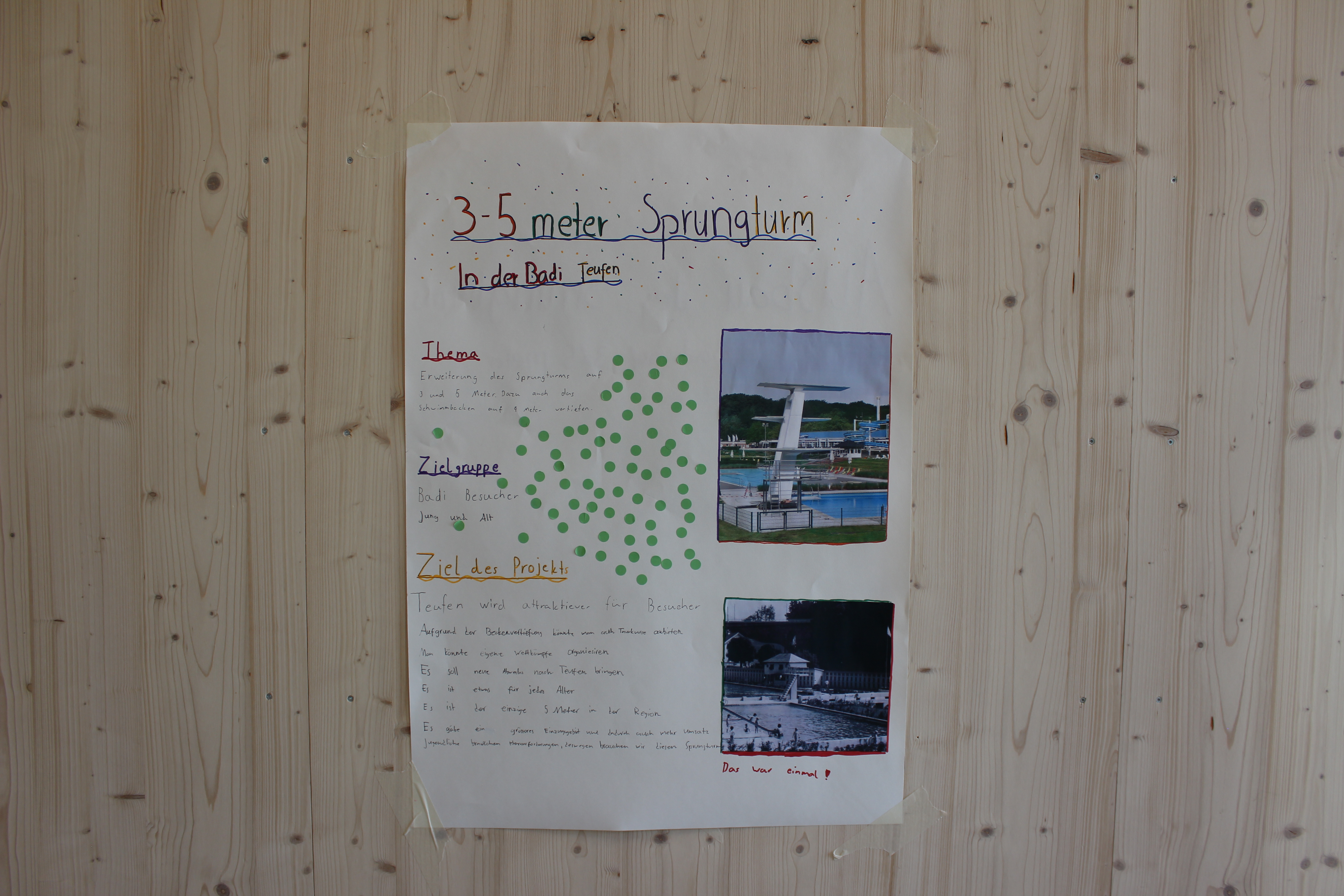Die meisten Stimmen erhielt die Idee eines Sprungturms für das Schwimmbad. Besonders überzeugte das Publikum die Kombination aus Freizeitwert, Machbarkeit und die Präsentation der Jugendlichen.